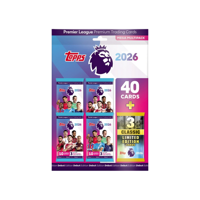 The Topps Premier League Trading Card Game: 2026 Debut Edition Mega Multipack contains 40 trading cards plus 3 random Classic Limited Edition cards. This innovative trading card collection brings fans closer than ever before to the new heroes of the Premier League.